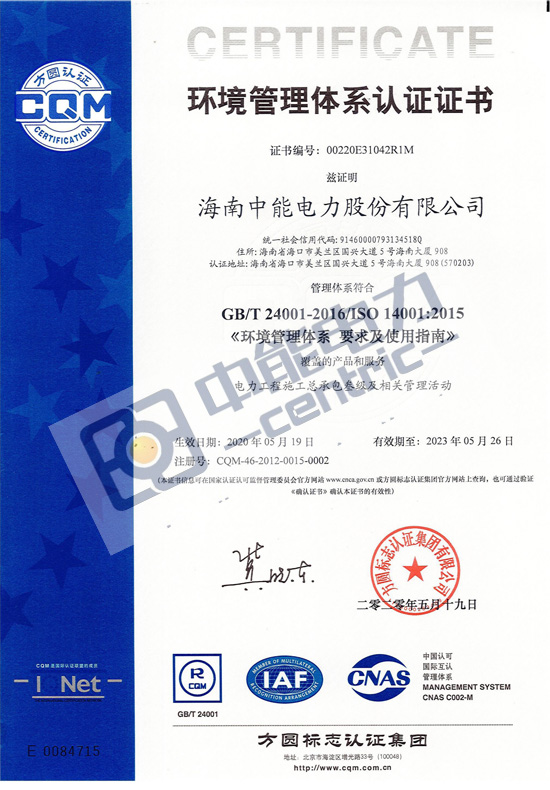环境管理体系认证证书